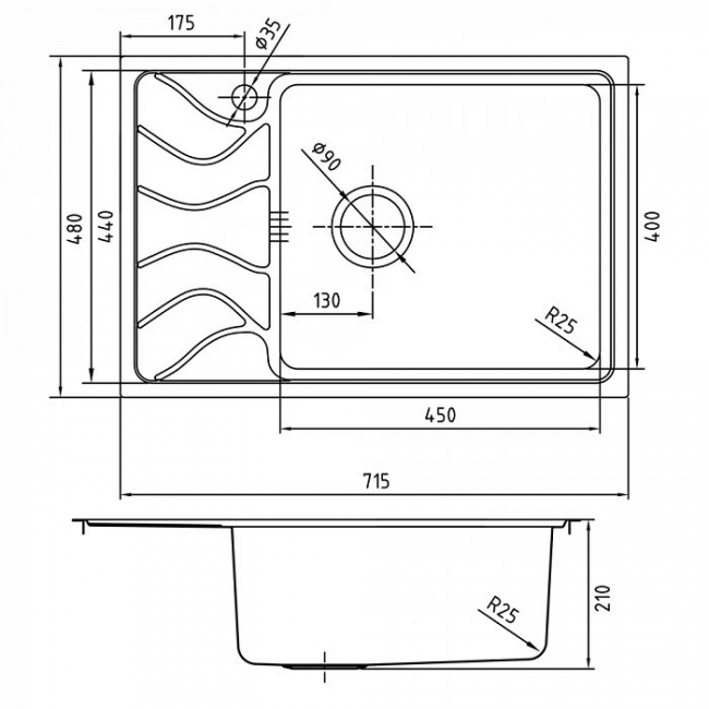 Комплектация: уплотнительная прокладка, крепления; Размер мойки: 715х480 мм; Сталь: нержавеющая, 0,9 мм; Ширина шкафа: от 50 см; Глубина чаши: 210 мм; Радиус закругления чаши: 25 мм