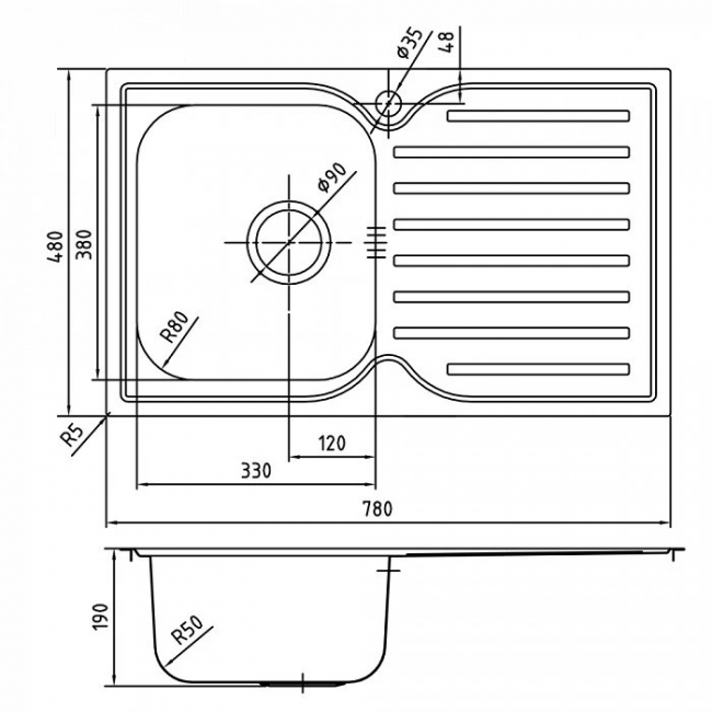 Комплектация: уплотнительная прокладка, крепления; Размер мойки: 780х480 мм; Сталь: нержавеющая, 0,8 мм; Ширина шкафа: от 45 см; Глубина чаши: 190 мм