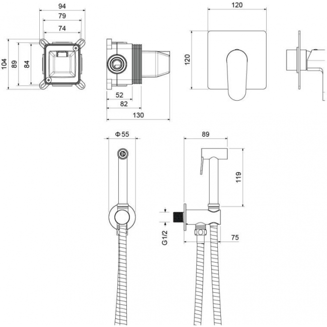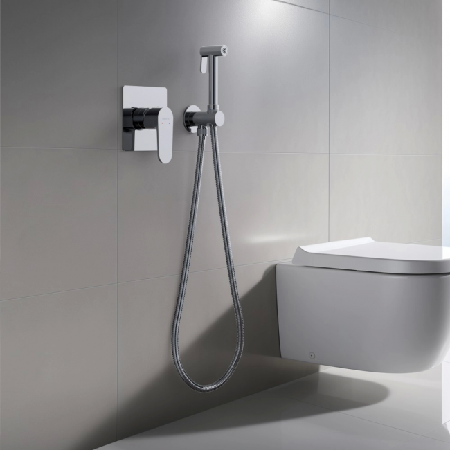 | Комплектация | 1. Смеситель для душа (внешняя и скрытая часть) 2. Душевой гарнитур: гигиеническая лейка, шланг, шланговое подсоединение с держателем 3. Декоративные накладки на стену из нержавеющей стали 3 мм |