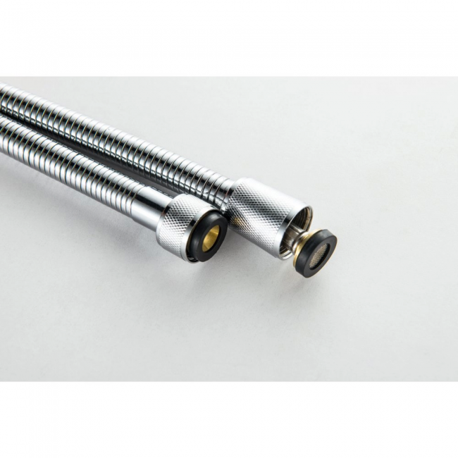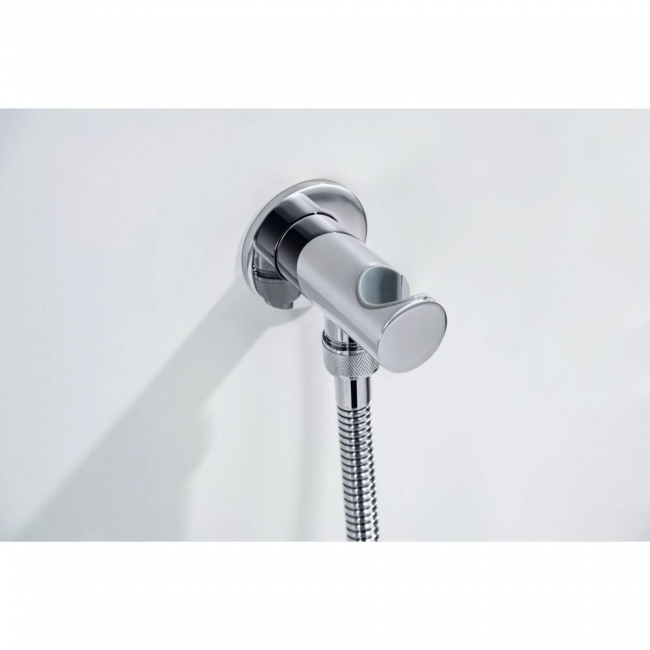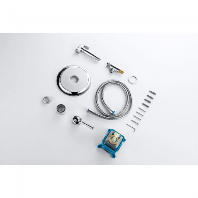 | Комплектация | 1. Смеситель для душа (внешняя и скрытая часть) 2. Душевой гарнитур: гигиеническая лейка, шланг, шланговое подсоединение с держателем 3. Декоративные накладки на стену из латуни 1,2 мм |