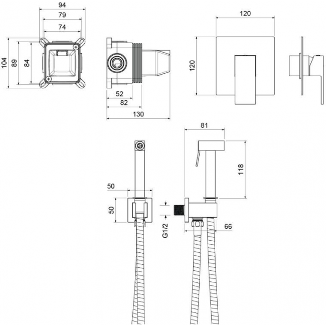 | Комплектация | 1. Смеситель для душа (внешняя и скрытая часть) 2. Душевой гарнитур: гигиеническая лейка, шланг, шланговое подсоединение с держателем 3. Декоративные накладки на стену из нержавеющей стали 3 мм |