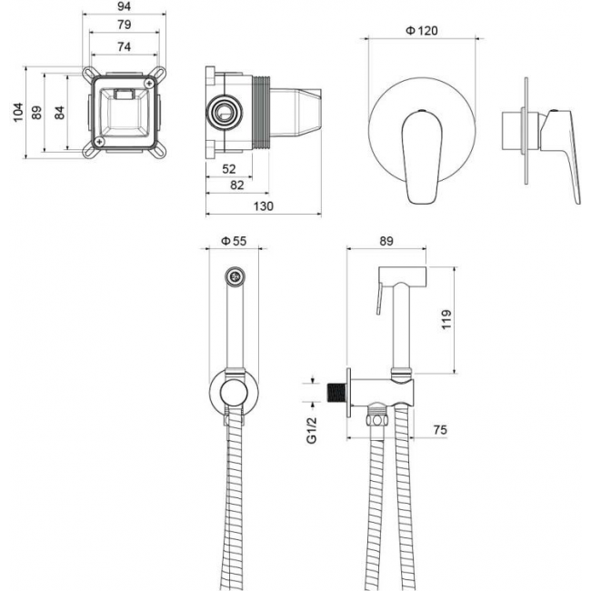 | Комплектация | 1. Смеситель для душа (внешняя и скрытая часть) 2. Душевой гарнитур: гигиеническая лейка, шланг, шланговое подсоединение с держателем) 3. Декоративные накладки на стену из нержавеющей стали 3 мм |