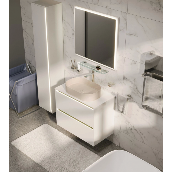 - Тумба под накладную раковину с подсветкой, артикул 1.3401 (6 матовых оттенков лака: антрацит, синий, олива, платина, папирус и белый + отделка шпоном в цвете дуб);