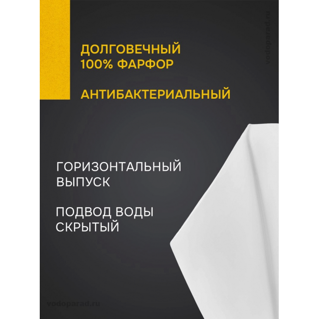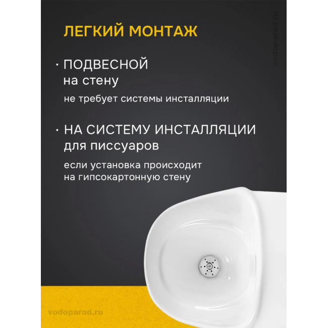 - Эргономичный дизайн — писсуар имеет гладкие линии и современный стиль, который легко впишется в любой интерьер. Он изготовлен из высококачественного санитарного фарфора, устойчивого к повреждениям и легкого в уходе.