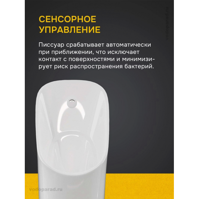 - Сенсорное управление — инновационная система автоматического слива обеспечивает максимальную гигиеничность и удобство использования. Писсуар активируется при приближении пользователя, что исключает контакт с поверхностями и минимизирует риск распространения бактерий. Источник питания — DC6V, 4 AA алкалиновые батарейки.