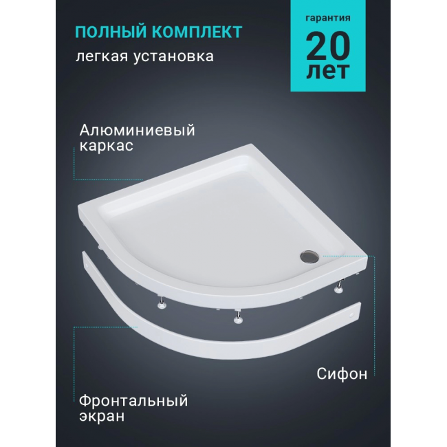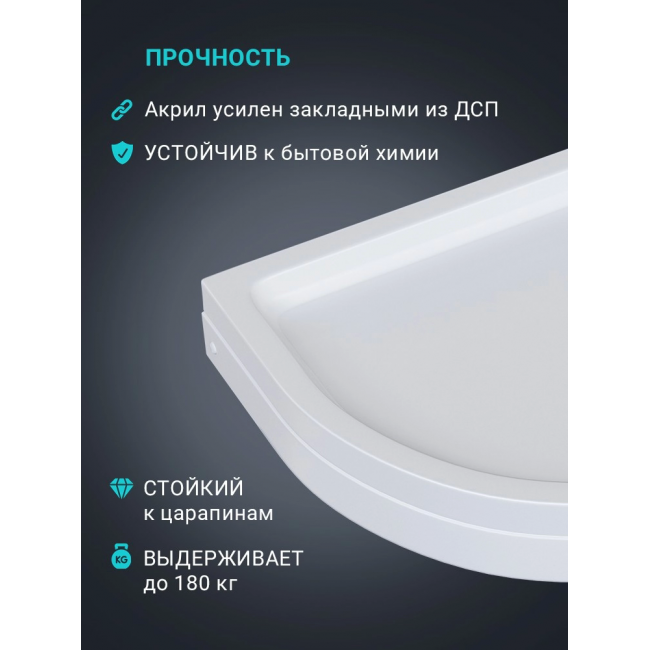 Акриловый поддон для душа — это современное и практичное решение для создания комфортного пространства в ванной комнате.Сантехнический акрил, из которого изготовлен поддон, это легкий, но в то же время очень прочный и надежный материал. Акрил не желтеет со временем и не впитывает грязь, легко моется и устойчив к воздействию бытовой химии. Нескользкая, но при этом гладкая поверхность, предотвращает развитие бактерий и грибков, обеспечивает комфорт и безопасность при душа. Акрил долго сохраняет тепло, что делает душевые процедуры более комфортными, особенно в холодное время года. Поддон устанавливается на цельносварной алюминиевый каркас с ножками, регулируемыми по высоте. Конструкция по всей площади усилена закладными из ДСП. Фронтальный экран легко снимается для доступа к сифону и коммуникациям, а низкий порожек делает вход удобным. Душевой поддон можно использовать как самостоятельно, так и в комплекте с душевыми уголками и ограждениями.Товар соответствует всем международным стандартам качества.