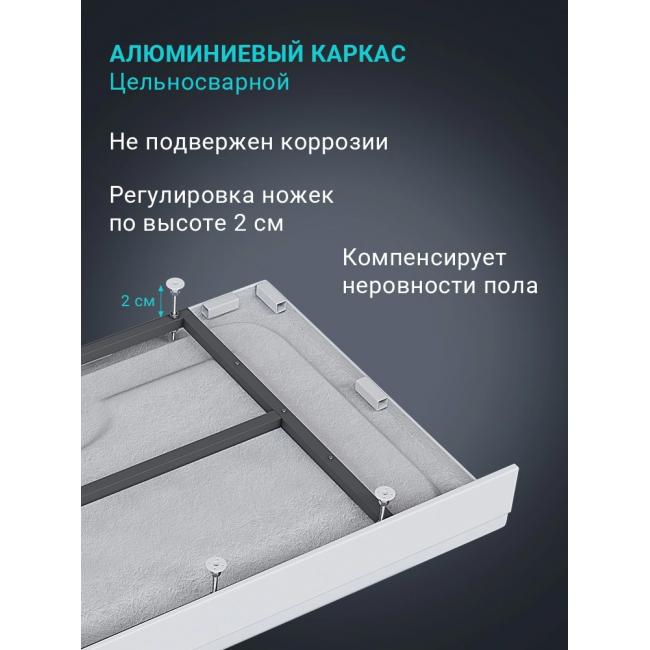 Акриловый поддон для душа — это современное и практичное решение для создания комфортного пространства в ванной комнате.Сантехнический акрил, из которого изготовлен поддон, это легкий, но в то же время очень прочный и надежный материал. Акрил не желтеет со временем и не впитывает грязь, легко моется и устойчив к воздействию бытовой химии. Нескользкая, но при этом гладкая поверхность, предотвращает развитие бактерий и грибков, обеспечивает комфорт и безопасность при душа. Акрил долго сохраняет тепло, что делает душевые процедуры более комфортными, особенно в холодное время года. Поддон устанавливается на цельносварной алюминиевый каркас с ножками, регулируемыми по высоте. Конструкция по всей площади усилена закладными из ДСП. Фронтальный экран легко снимается для доступа к сифону и коммуникациям, а низкий порожек делает вход удобным. Душевой поддон можно использовать как самостоятельно, так и в комплекте с душевыми уголками и ограждениями.Поддон Benneri поставляется в комплекте со всеми необходимыми комплектующими и полностью готов к установке, докупать ничего не нужно.Товар соответствует всем международным стандартам качества. Гарантия – 20 лет.
