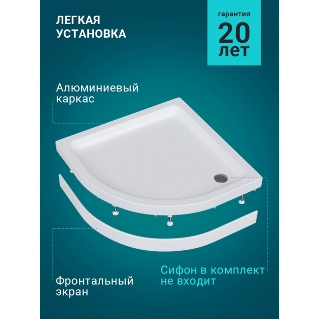 Акриловый поддон для душа — это современное и практичное решение для создания комфортного пространства в ванной комнате.Сантехнический акрил, из которого изготовлен поддон, это легкий, но в то же время очень прочный и надежный материал. Акрил не желтеет со временем и не впитывает грязь, легко моется и устойчив к воздействию бытовой химии. Нескользкая, но при этом гладкая поверхность, предотвращает развитие бактерий и грибков, обеспечивает комфорт и безопасность при душа. Акрил долго сохраняет тепло, что делает душевые процедуры более комфортными, особенно в холодное время года. Поддон устанавливается на цельносварной алюминиевый каркас с ножками, регулируемыми по высоте. Конструкция по всей площади усилена закладными из ДСП. Фронтальный экран легко снимается для доступа к сифону и коммуникациям, а низкий порожек делает вход удобным. Душевой поддон можно использовать как самостоятельно, так и в комплекте с душевыми уголками и ограждениями.Товар соответствует всем международным стандартам качества.