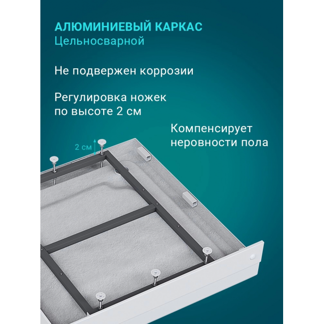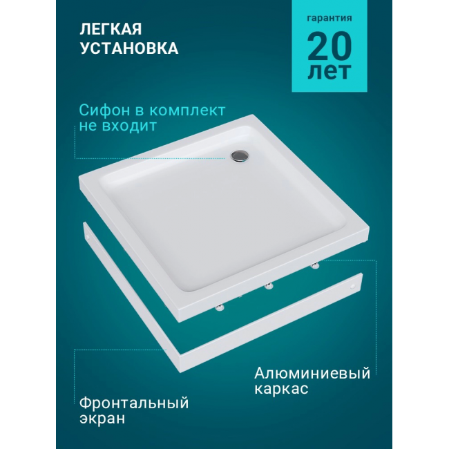 Акриловый поддон для душа — это современное и практичное решение для создания комфортного пространства в ванной комнате.Сантехнический акрил, из которого изготовлен поддон, это легкий, но в то же время очень прочный и надежный материал. Акрил не желтеет со временем и не впитывает грязь, легко моется и устойчив к воздействию бытовой химии. Нескользкая, но при этом гладкая поверхность, предотвращает развитие бактерий и грибков, обеспечивает комфорт и безопасность при душа. Акрил долго сохраняет тепло, что делает душевые процедуры более комфортными, особенно в холодное время года. Поддон устанавливается на цельносварной алюминиевый каркас с ножками, регулируемыми по высоте. Конструкция по всей площади усилена закладными из ДСП. Фронтальный экран легко снимается для доступа к сифону и коммуникациям, а низкий порожек делает вход удобным. Душевой поддон можно использовать как самостоятельно, так и в комплекте с душевыми уголками и ограждениями.Товар соответствует всем международным стандартам качества