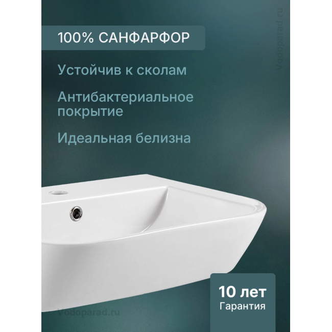 Элегантная прямоугольная чаша раковины выполнена из 100% санитарного фарфора, покрытого прочной глазурью, легко очищается обычными бытовыми средствами и сохраняет белизну на протяжении всего срока службы.