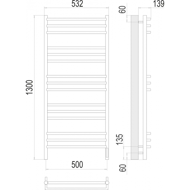 - Межосевое расстояние полотенцесушителя, мм: 500