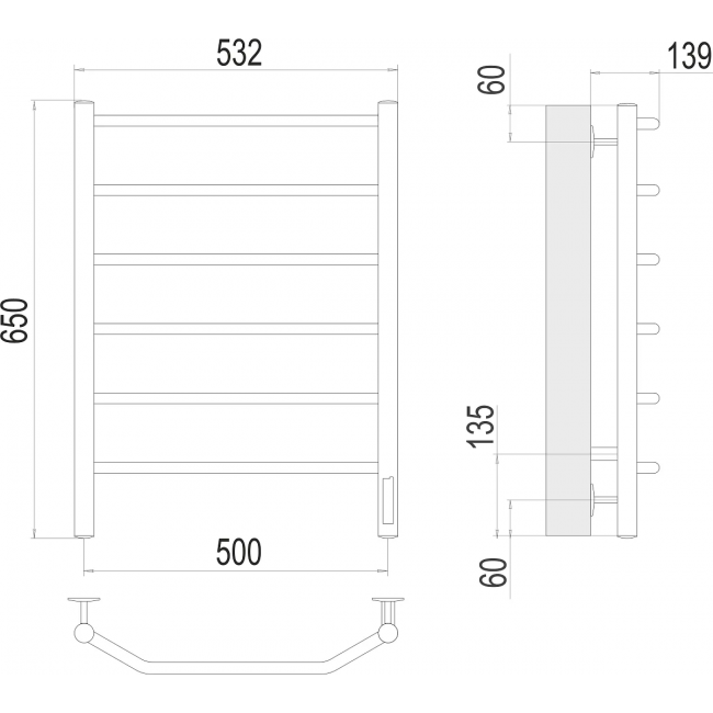- Межосевое расстояние полотенцесушителя, мм: 500