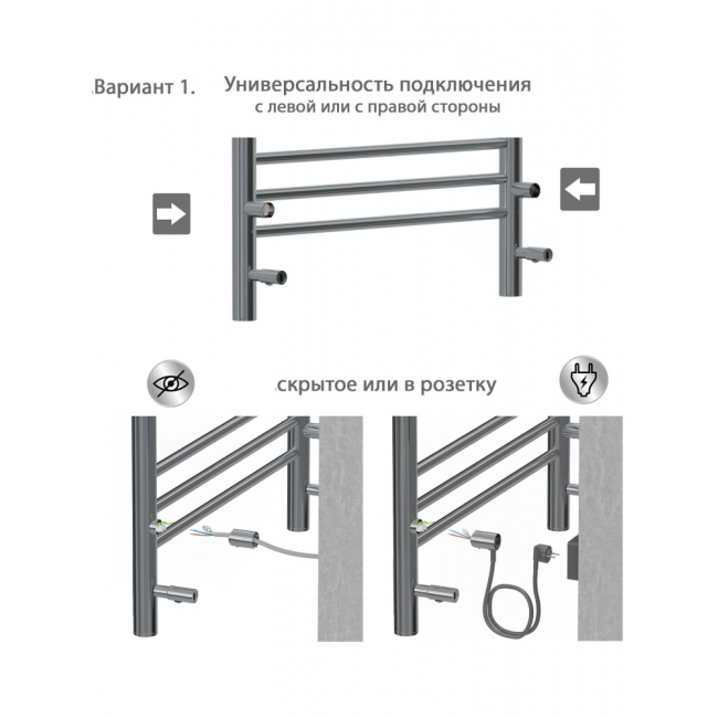 - Простота установки и полная комплектация, изделие готово к установке — все необходимое для монтажа уже в комплекте. Для монтажа не потребуется профессиональная помощь или использование сложных инструментов. Достаточно закрепить полотенцесушитель на стене в непосредственной близости от розетки. Габарит выступа от стены регулируется телескопическими крепежами