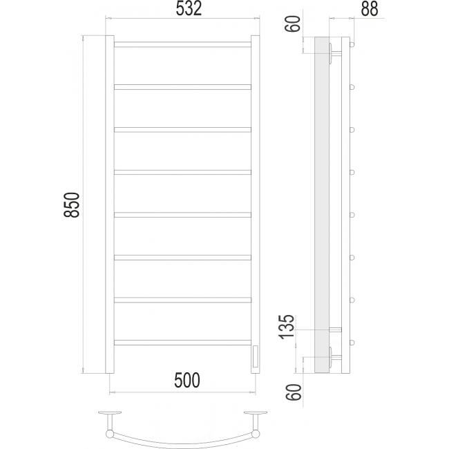- Межосевое расстояние полотенцесушителя, мм: 500
