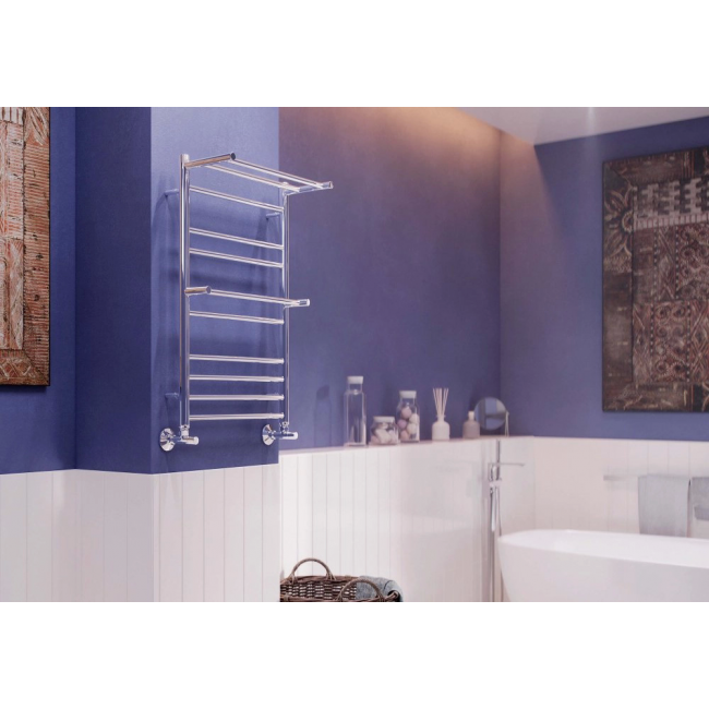 - Простота установки — водяной полотенцесушитель легко монтируется на стену и подключается к системе горячего водоснабжения, что позволяет сэкономить время и силы на установку. Габарит выступа от стены регулируется телескопическими крепежами