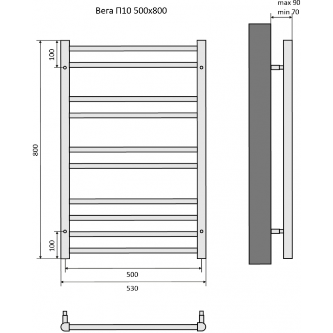 - Простота установки — водяной полотенцесушитель легко монтируется на стену и подключается к системе горячего водоснабжения, что позволяет сэкономить время и силы на установку. Габарит выступа от стены регулируется телескопическими крепежами
