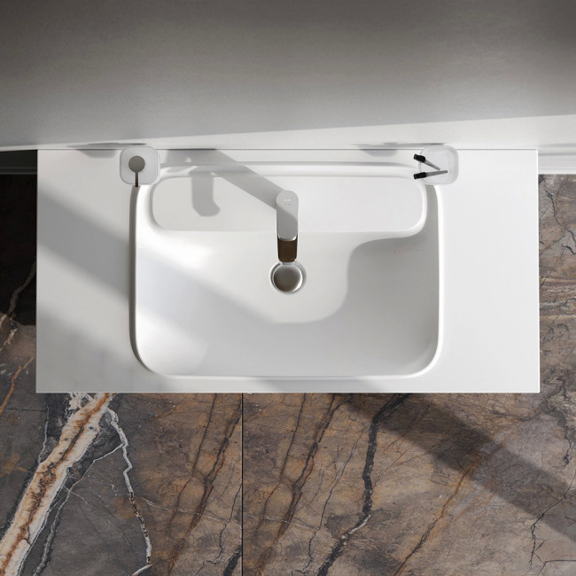 Раковина выполнена из литьевого мрамора. Матовая поверхность раковины придает интерьеру ощущение уюта и комфорта. Бортик по контуру чаши и база под смеситель в виде острова - защищают от пролива воды.
