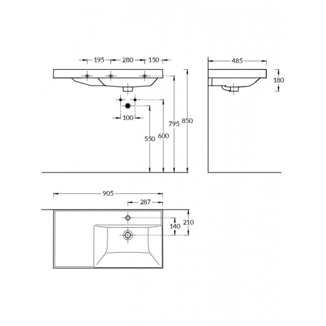 Ассиметричная версия раковины CUBO с широкой площадкой в двух версиях: с правым и левым расположением чаши.