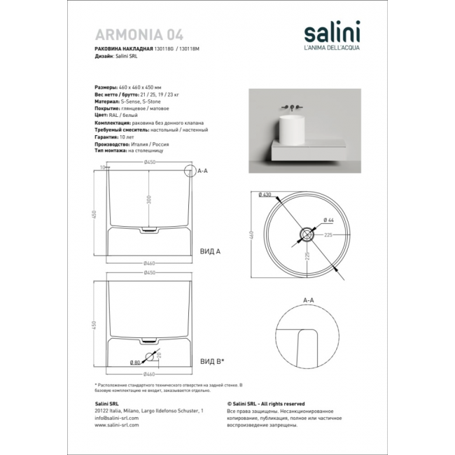 Раковина накладная Salini Armonia 04 46 130118M белый купить с доставкой. 100% Оригинал. Гарантия!