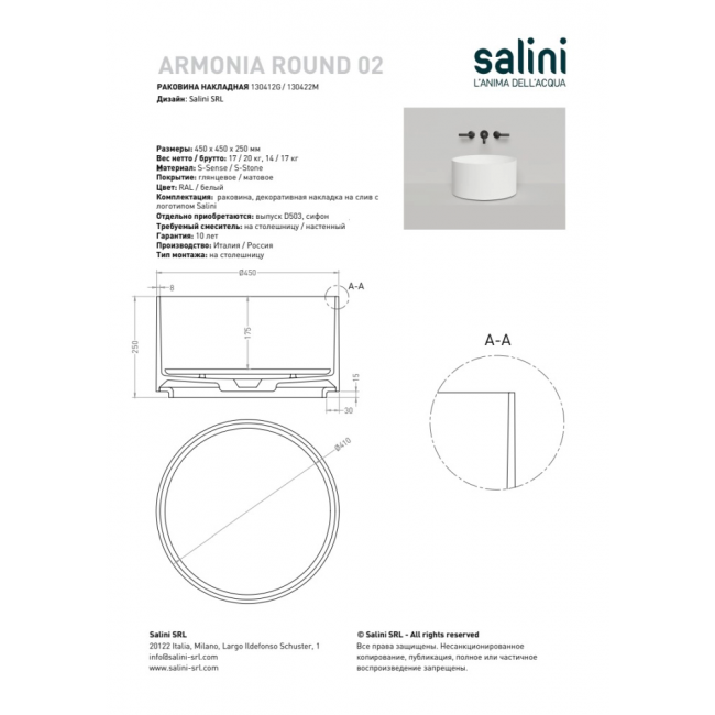 Раковина накладная Salini Armonia Round 02 45 130422M белый купить с доставкой. 100% Оригинал. Гарантия!