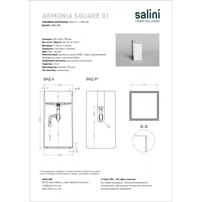 Раковина напольная Salini Armonia Square 01 45 130511G белый купить с доставкой. 100% Оригинал. Гарантия!