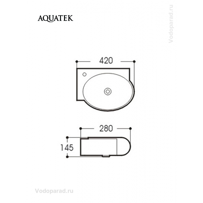 Все модели Aquatek изготовлены из высококачественного глазурованного 100% санитарного фарфора, который на протяжении всего срока службы сохраняет идеальную белизну. В данной модели раковины предусмотрены отверстие для установки смесителя и встроенный канал слива-перелива в виде специальной полости на случай переполнения чаши. Раковина выполнена в едином стиле с другими предметами этой же коллекции – биде и унитазами. Установка накладной раковины не требует сложного монтажа, ее можно установить практически на любую ровную поверхность.