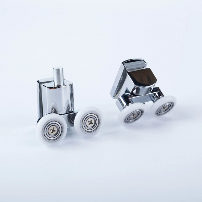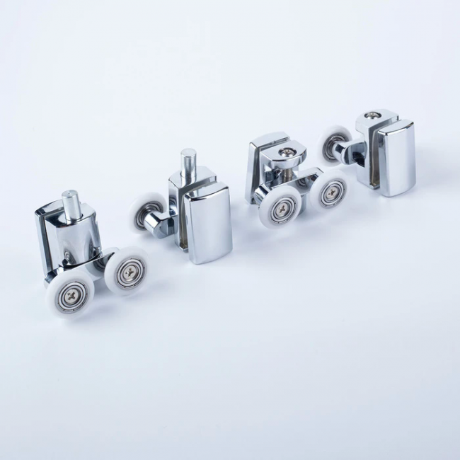 Комплект роликов для раздвижных дверей душевой кабины или ограждения. Подходят для стекол толщиной 7-8 мм. Комплект из 4 штук (2 верхних и 2 нижних ролика).