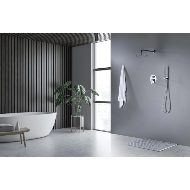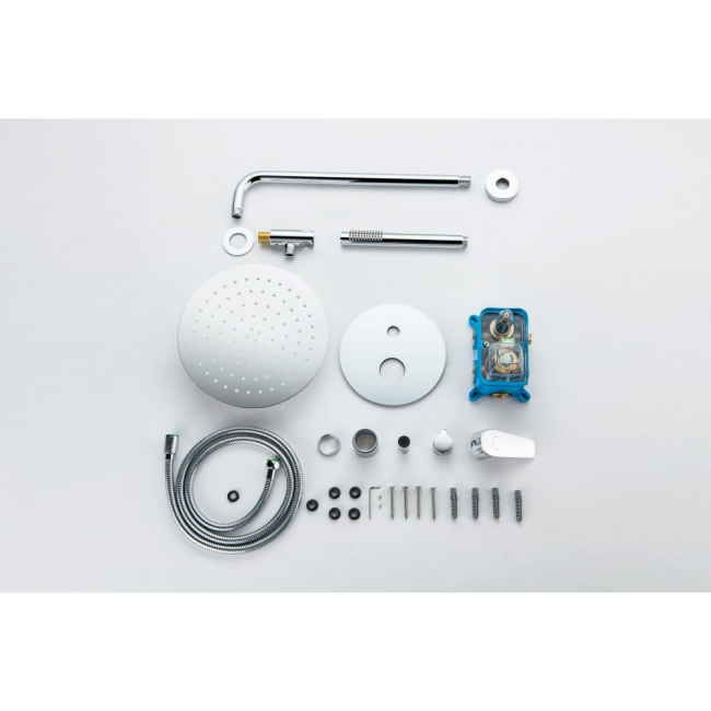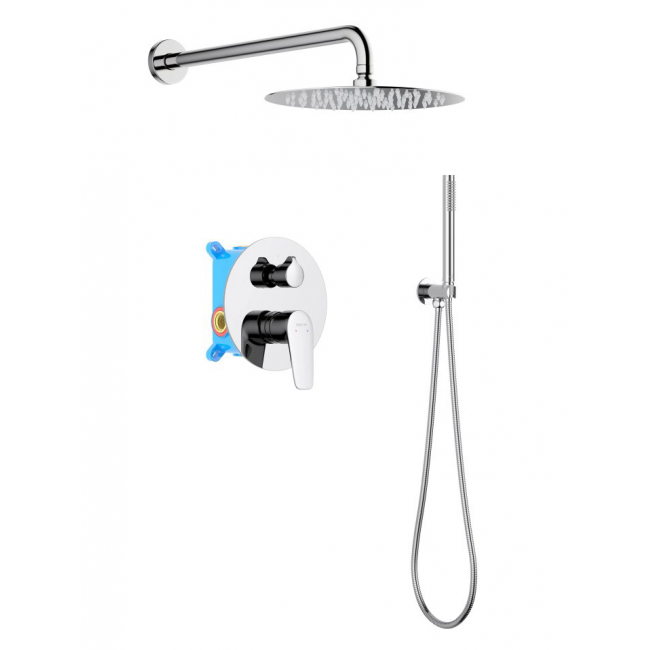 | Комплектация | 1. Смеситель из латуни с установочной коробкой на 2 потребителя (внешняя и скрытая часть) 2. Душевой гарнитур: лейка, шланг, шланговое подсоединение с держателем 3. Верхний душ 4. Декоративные накладки на стену из нержавеющей стали 3 мм |