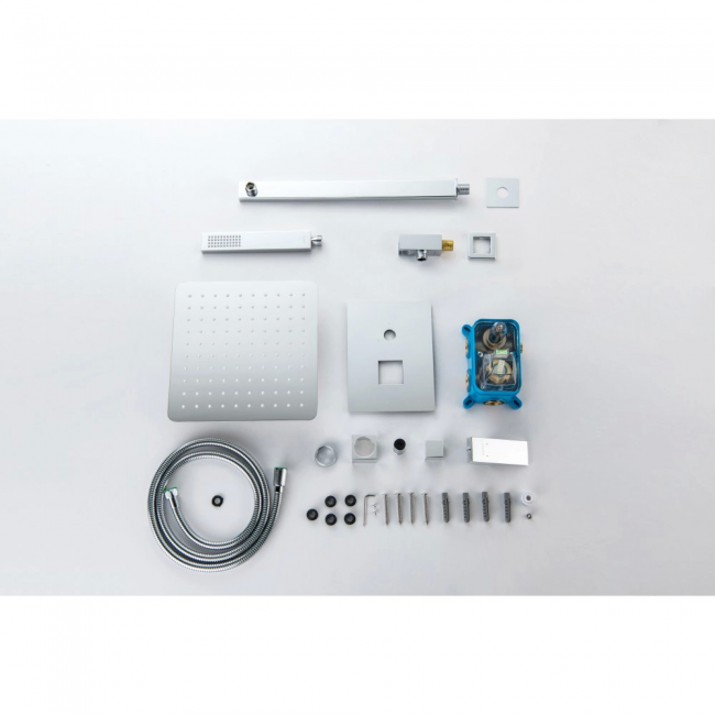 | Комплектация | 1. Смеситель из латуни с установочной коробкой на 2 потребителя (внешняя и скрытая часть) 2. Душевой гарнитур: лейка, шланг, шланговое подсоединение с держателем 3. Верхний душ 4. Декоративные накладки на стену из нержавеющей стали 3 мм |