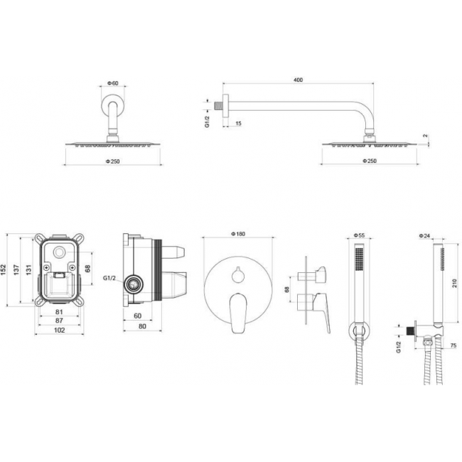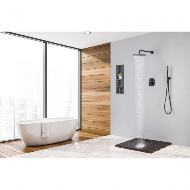 | Комплектация | 1. Смеситель из латуни с установочной коробкой на 2 потребителя (внешняя и скрытая часть) 2. Душевой гарнитур: лейка, шланг, шланговое подсоединение с держателем 3. Верхний душ 4. Декоративные накладки на стену из нержавеющей стали 3 мм |