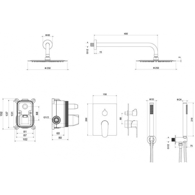 | Комплектация | 1. Смеситель из латуни с установочной коробкой на 2 потребителя (внешняя и скрытая часть) 2. Душевой гарнитур: лейка, шланг, шланговое подсоединение с держателем 3. Верхний душ 4. Декоративные накладки на стену из нержавеющей стали 3 мм |