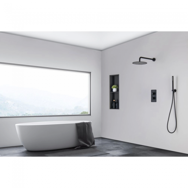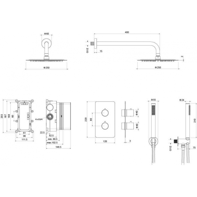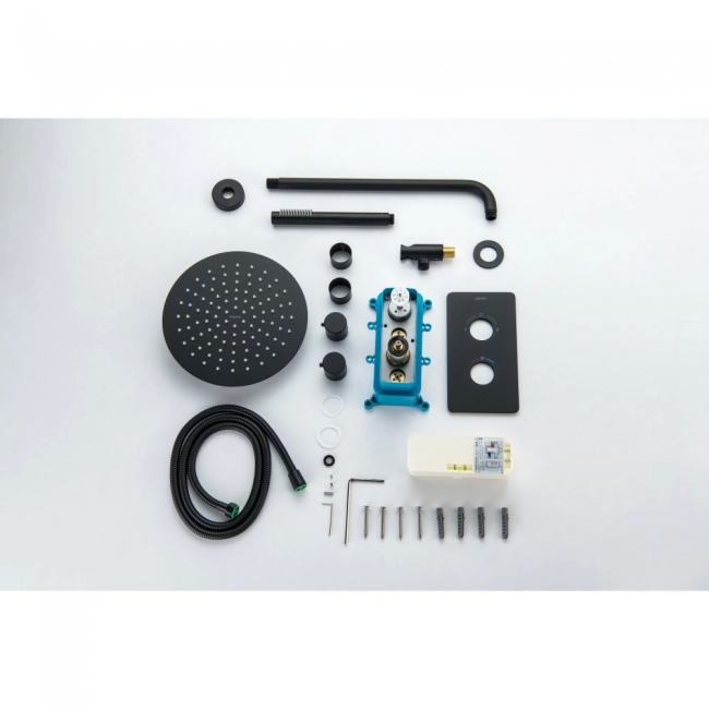 | Комплектация | 1. Смеситель термостатический из латуни на 2 потребителя (внешняя и скрытая часть) 2. Душевой гарнитур: лейка, шланг, шланговое подсоединение с держателем 3. Верхний душ 4. Декоративные накладки на стену из нержавеющей стали 3 мм |