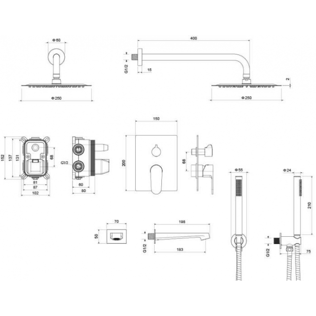 | Комплектация | 1. Смеситель из латуни с установочной коробкой на 3 потребителя (внешняя и скрытая часть) 2. Душевой гарнитур: лейка, шланг, шланговое подсоединение с держателем 3. Верхний душ 4. Излив 5. Декоративные накладки на стену из нержавеющей стали 3 мм |