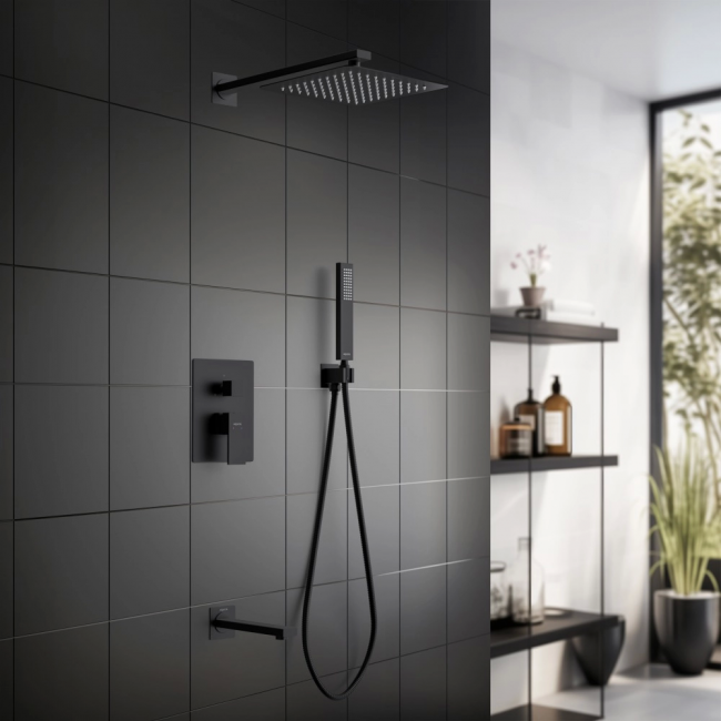 | Комплектация | 1. Смеситель из латуни с установочной коробкой на 3 потребителя (внешняя и скрытая часть) 2. Душевой гарнитур: лейка, шланг, шланговое подсоединение с держателем 3. Верхний душ 4. Излив 5. Декоративные накладки на стену из нержавеющей стали 3 мм |