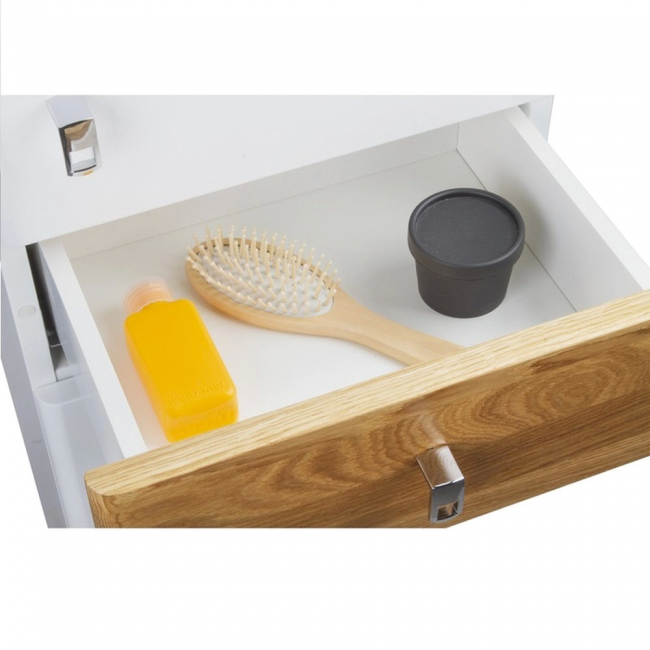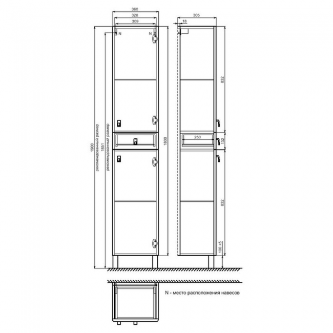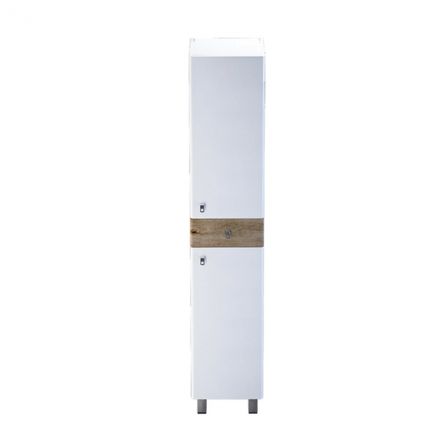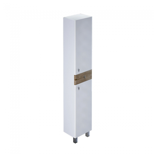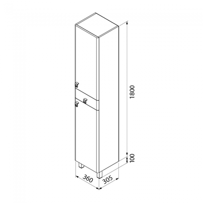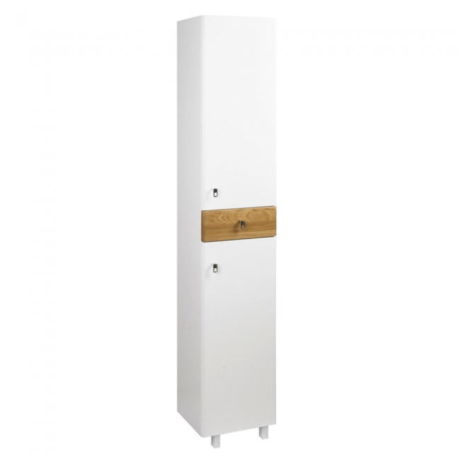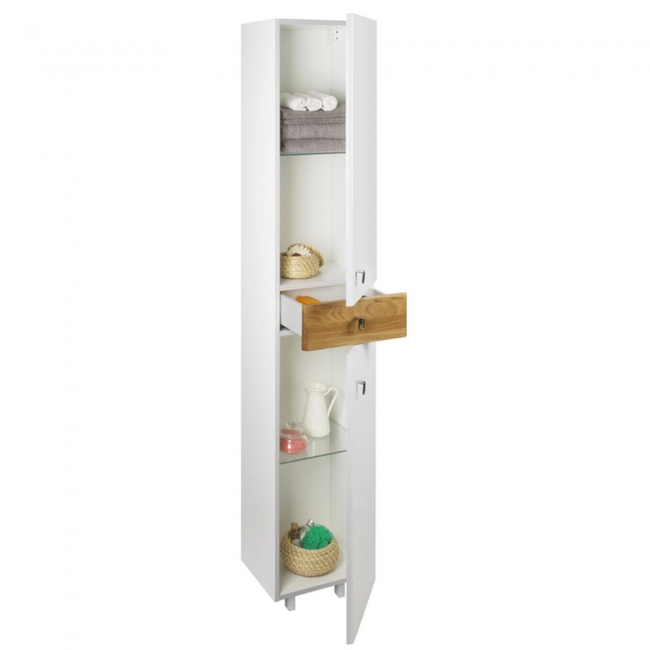Пенал для ванной комнаты, напольный. Размеры: 305х360х1800 мм (ДхШхВ). Фасады МДФ 19 мм в эмали (цвет белый глянец). Корпус влагостойкий ЛДСП 16 мм в эмали. Стеклянные полки 4 мм с фиксаторами. Ящик с фасадом из массива дуба. Петли с доводчиками. Упаковка: картон, пленка, пенопластовые уголки.