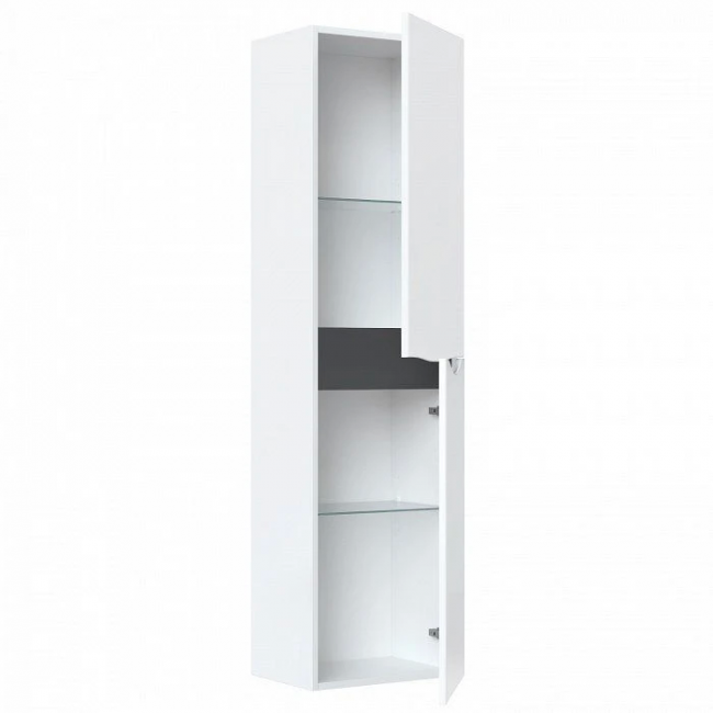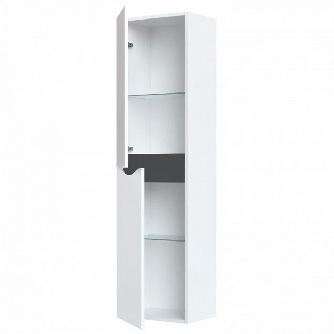 Пенал для ванной комнаты, подвесной. Цвет белый. Ширина 40 см. Фасады МДФ в эмали, фрезеровка. Две дверцы с интегрированными ручками. Стеклянные полки с фиксаторами. Упаковка: картон, пленка, пенопластовые уголки.