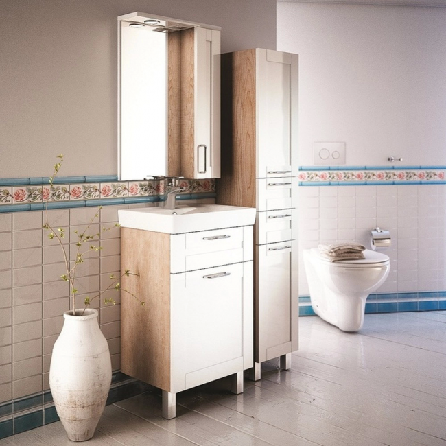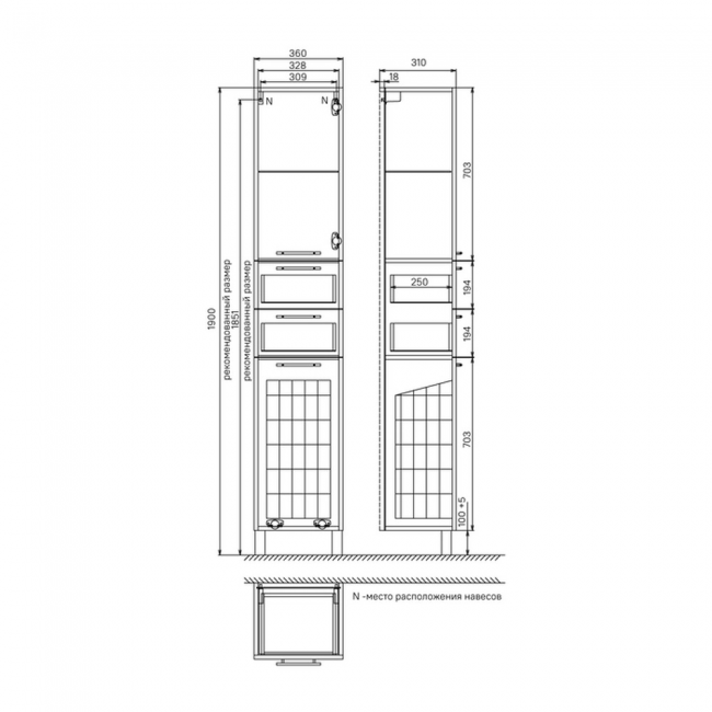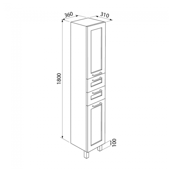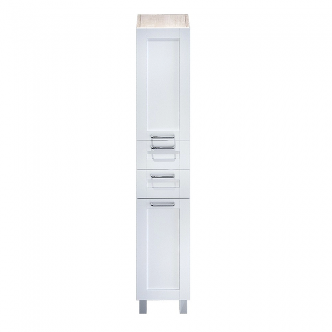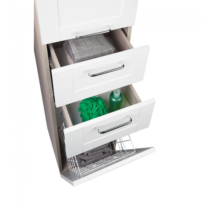 Пенал для ванной комнаты, напольный. Размеры: 310х360х1800 мм (ДхШхВ). Фасад МДФ 19 мм в эмали (цвет белый глянец), фрезеровка. Корпус ВЛДСП 16 мм под дерево.Петли с доводчиками. Дверцы с хромированными ручками. Ящики без доводчиков. Стеклянные полки 4 мм с фиксаторами. Съемная корзина для белья. Упаковка: картон, пленка, пенопластовые уголки.