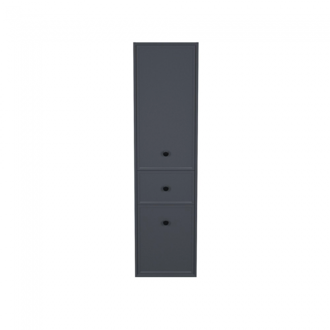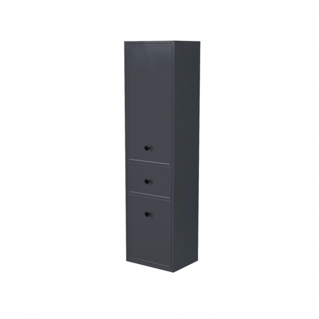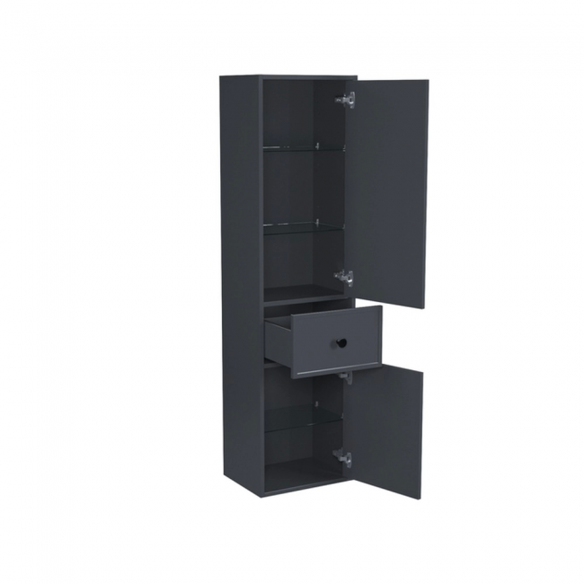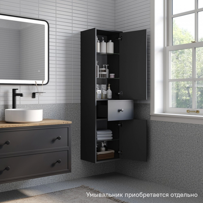 Подвесной пенал Torr трендового темно-серого цвета сочетает в себе узнаваемый стиль и практичность популярного скандинавского дизайна. Четкие формы пенала, фасады с декоративной филенкой, круглые ручки смотрятся гармонично и впишутся в любой современный интерьер. Удобный выдвижной ящик создает пространство для хранения нужных мелочей. Внутри ящик графитового цвета – стильно и практично. Стеклянные полки надежно фиксируются специальным механизмом, что предотвращает риск их случайного повреждения. Покрытие качественной влагостойкой пленкой, разработанной для использования в помещениях с высокой влажностью, сохранит первоначальный вид мебели надолго (при должном уходе). Надежная фурнитура Hettich рассчитана на 30 000 открываний – это более 10 лет исправной работы.Гарантия на мебель IDDIS® – 3 года.