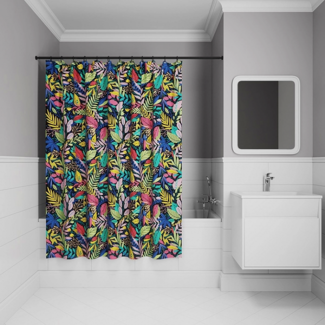 Текстильная штора для ванной с ярким разноцветным растительным принтом на черном фоне. • Изготовлена из износостойкого полиэстера с усиленной водонепроницаемой пропиткой. При попадании на ткань вода не впитывается, а скатывается каплями, даже при сильном напоре воды. • В комплекте 12 колец С-формы из прозрачного пластика. • По верхнему краю расположены 12 прозрачных пластиковых люверсов. • Штора имеет утяжеляющую нить по нижнему краю, которая позволяет избежать задирания ткани.• Легко ухаживать: шторку для ванной комнаты можно стирать в стиральной машине в деликатном режиме и гладить утюгом на минимальной температуре.