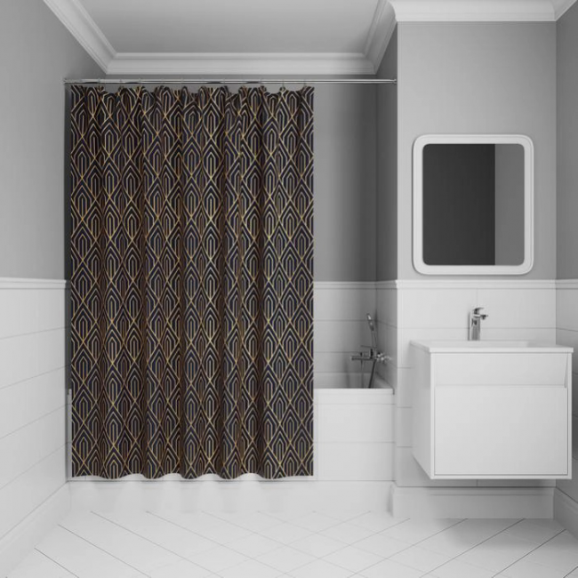 Текстильная штора глубокого синего цвета с крупным геометричным золотым узором в стиле ар-деко создаст утонченное элегантное настроение даже в самом простом интерьере.• Изготовлена из износостойкого полиэстера с водоотталкивающей пропиткой. При попадании на ткань вода не впитывается, а скатывается каплями, даже при сильном напоре воды. • В комплекте 12 колец С-формы из прозрачного пластика. • По верхнему краю расположены 12 прозрачных пластиковых люверсов. • Штора имеет утяжеляющую нить по нижнему краю, которая позволяет избежать задирания ткани.• Легко ухаживать: шторку для ванной комнаты можно стирать в стиральной машине в деликатном режиме и гладить утюгом на минимальной температуре.