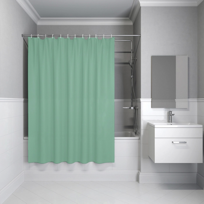 Текстильная штора для ванной в трендовом зеленом оттенке будет гармонично смотреться в любом современном интерьере. Увеличенный размер – 20х24 см.• Изготовлена из износостойкого полиэстера с водоотталкивающей пропиткой. При попадании на ткань вода не впитывается, а скатывается каплями, даже при сильном напоре воды. • В комплекте 12 колец С-формы из прозрачного пластика. • По верхнему краю расположены 12 прозрачных пластиковых люверсов. • Штора имеет утяжеляющую нить по нижнему краю, которая позволяет избежать задирания ткани.• Легко ухаживать: шторку для ванной комнаты можно стирать в стиральной машине в деликатном режиме и гладить утюгом на минимальной температуре.