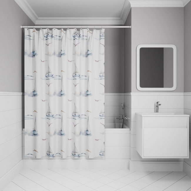 Текстильная штора для ванной белого цвета с акварельным принтом в виде чаек и яхт на морских волнах. Штора освежит пространство и привнесет в него легкое настроение. • Изготовлена из износостойкого полиэстера с водоотталкивающей пропиткой. При попадании на ткань вода не впитывается, а скатывается каплями, даже при сильном напоре воды. • В комплекте 12 колец С-формы из прозрачного пластика. • По верхнему краю расположены 12 прозрачных пластиковых люверсов. • Штора имеет утяжеляющую нить по нижнему краю, которая позволяет избежать задирания ткани.• Легко ухаживать: шторку для ванной комнаты можно стирать в стиральной машине в деликатном режиме и гладить утюгом на минимальной температуре.