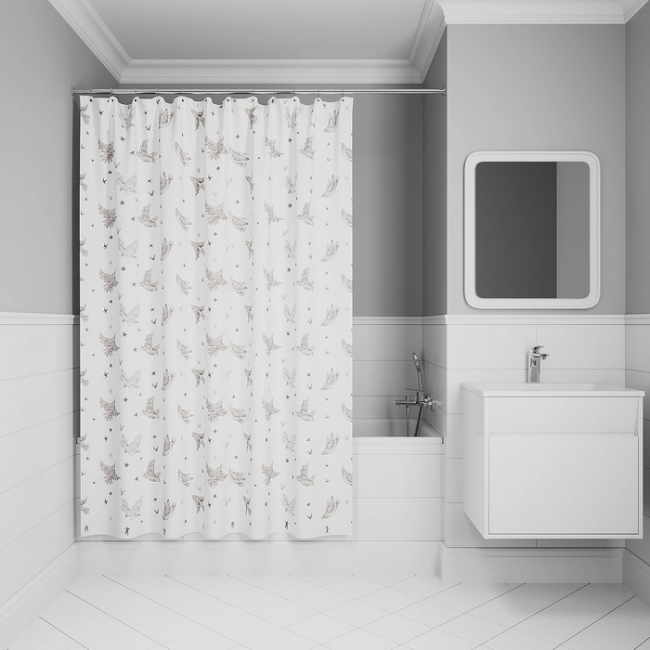 Текстильная штора для ванной белого цвета с принтом в виде летящих птиц. Штора освежит пространство и привнесет в него легкое настроение.• Изготовлена из износостойкого полиэстера с водоотталкивающей пропиткой. При попадании на ткань вода не впитывается, а скатывается каплями, даже при сильном напоре воды. • В комплекте 12 колец С-формы из прозрачного пластика. • По верхнему краю расположены 12 прозрачных пластиковых люверсов. • Штора имеет утяжеляющую нить по нижнему краю, которая позволяет избежать задирания ткани.• Легко ухаживать: шторку для ванной комнаты можно стирать в стиральной машине в деликатном режиме и гладить утюгом на минимальной температуре.