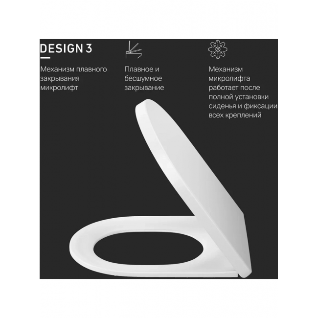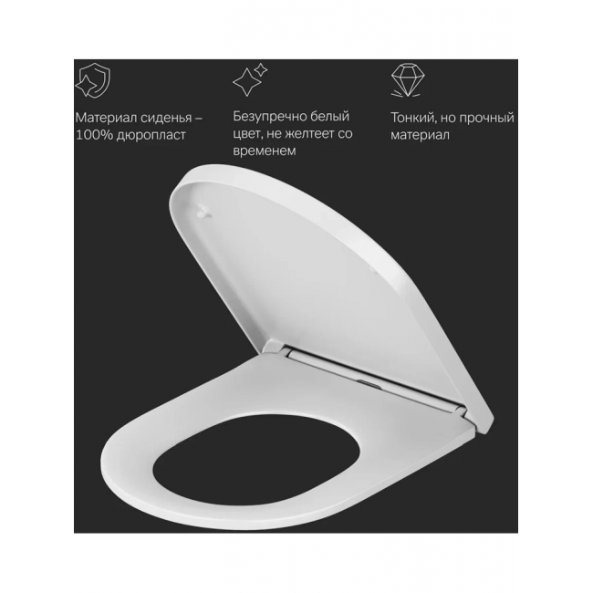 Материал сиденья дюропласт, устойчивый к появлению царапин, в сочетании с креплениями из нержавеющей стали гарантируют долговечность сиденья. Механизм плавного опускания, рассчитанный на 100 000 закрываний - комфорт в использовании, механизм быстрого снятия - легкость в уходе за сиденьем и керамикой.