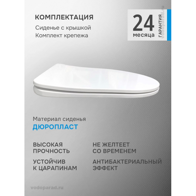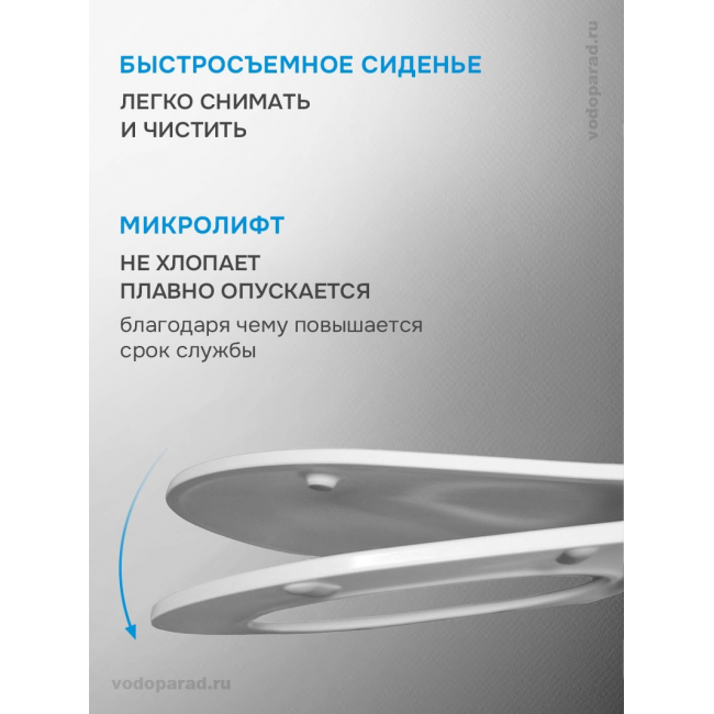 Ультратонкое сиденье из дюропласта не царапается, остаётся белоснежным на протяжении всего срока службы благодаря повышенной прочности и антибактериальным свойствам материала. Плавное и бесшумное опускание крышки сиденья благодаря микролифту и системе Soft Close обеспечивает комфорт при использовании. Сиденье легко снимается для уборки одним нажатием кнопки и также легко устанавливается обратно.