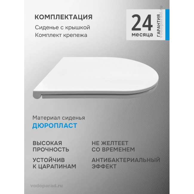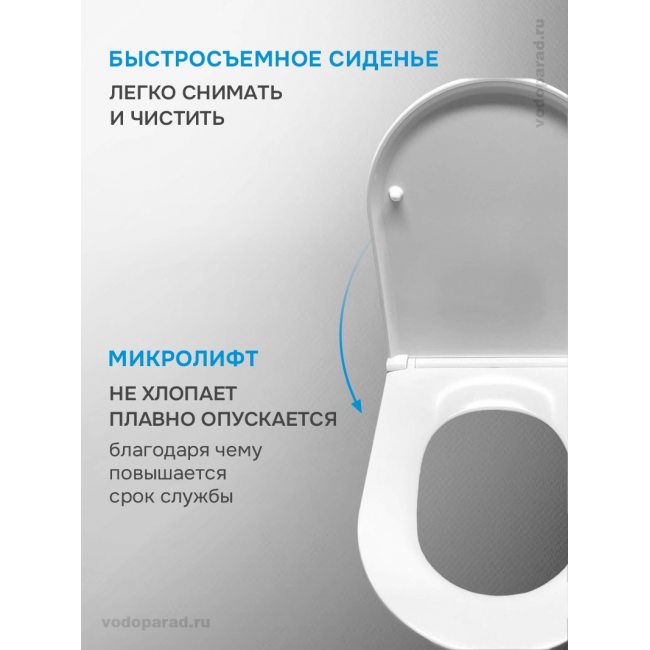 Ультратонкое сиденье из дюропласта не царапается, остаётся белоснежным на протяжении всего срока службы благодаря повышенной прочности и антибактериальным свойствам материала. Плавное и бесшумное опускание крышки сиденья благодаря микролифту и системе Soft Close обеспечивает комфорт при использовании. Сиденье легко снимается для уборки одним нажатием кнопки и также легко устанавливается обратно.