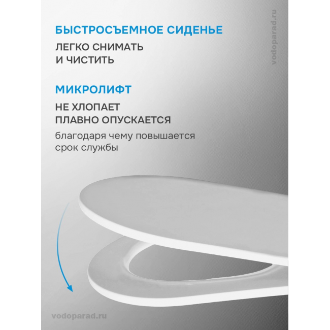 Ультратонкое сиденье из дюропласта не царапается, остаётся белоснежным на протяжении всего срока службы благодаря повышенной прочности и антибактериальным свойствам материала. Плавное и бесшумное опускание крышки сиденья благодаря микролифту и системе Soft Close обеспечивает комфорт при использовании. Сиденье легко снимается для уборки одним нажатием кнопки и также легко устанавливается обратно.