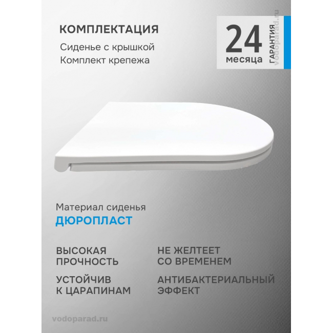 Ультратонкое сиденье из дюропласта не царапается, сохраняет первоначальный цвет на протяжении всего срока службы благодаря повышенной прочности и антибактериальным свойствам материала. Плавное и бесшумное опускание крышки сиденья благодаря микролифту и системе Soft Close обеспечивает комфорт при использовании. Сиденье легко снимается для уборки одним нажатием кнопки и также легко устанавливается обратно.