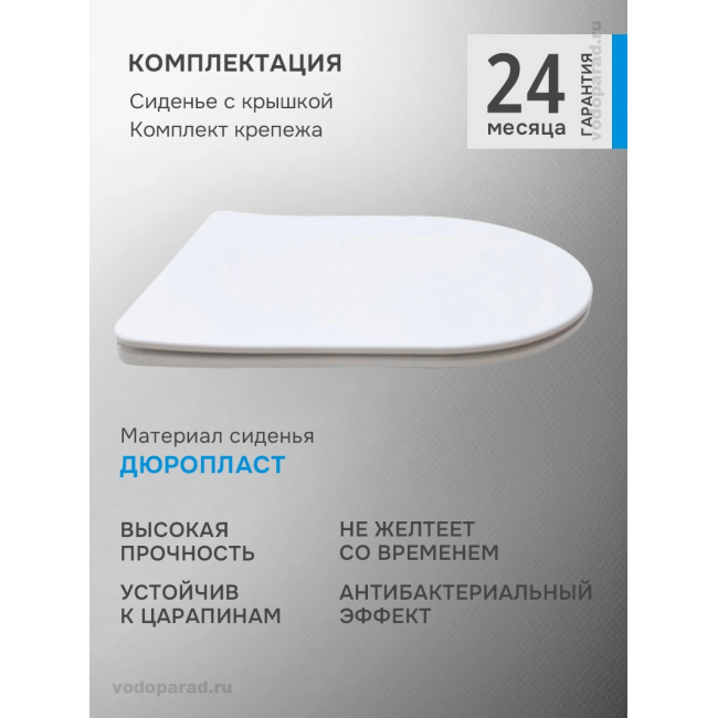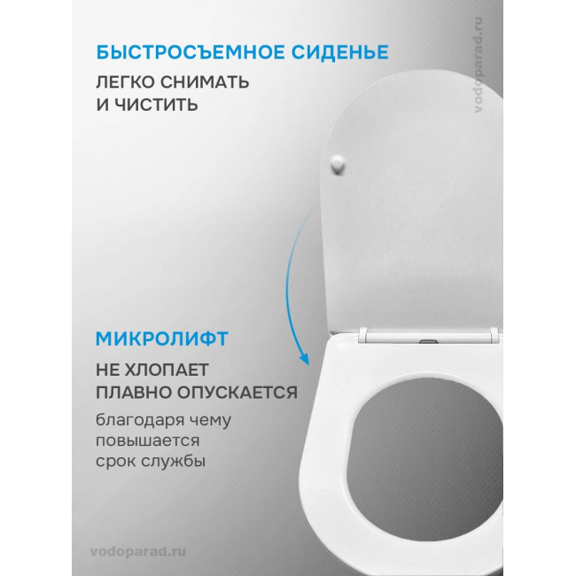 Ультратонкое сиденье из дюропласта не царапается, остаётся белоснежным на протяжении всего срока службы благодаря повышенной прочности и антибактериальным свойствам материала. Плавное и бесшумное опускание крышки сиденья благодаря микролифту и системе Soft Close обеспечивает комфорт при использовании. Сиденье легко снимается для уборки одним нажатием кнопки и также легко устанавливается обратно.