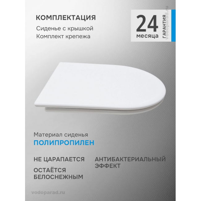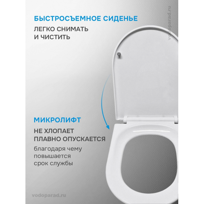 Ультратонкое сиденье из дюропласта не царапается, остаётся белоснежным на протяжении всего срока службы благодаря повышенной прочности и антибактериальным свойствам материала. Плавное и бесшумное опускание крышки сиденья благодаря микролифту и системе Soft Close обеспечивает комфорт при использовании. Сиденье легко снимается для уборки одним нажатием кнопки и также легко устанавливается обратно.